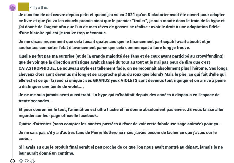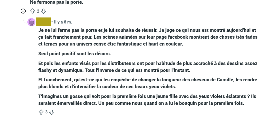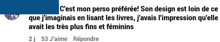 Je vous mets qu’un seul exemple, mais il est décliné à l’infini sur les réseaux, avec le même pattern : une déception liée au fait que les designs ne correspondraient pas aux livres. Ces commentaires ont peu de précisions ou d’argumentation, ce qui complique la compréhension de la situation. Enfin, là où l’usage des RS est plutôt de liker les commentaires disant la même chose, certains internautes l’ont répété ad nauseam.