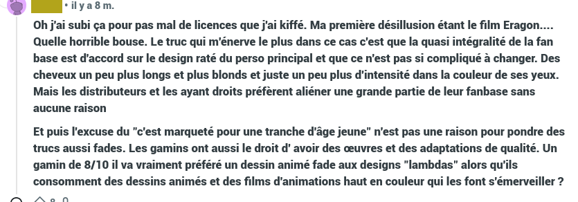 Pour avoir travaillé en librairie, le schéma est courant : les gens achètent une BD au dessin, mais quand ils reviennent et qu’on leur demande s’ils ont aimés et ce dont ils se souviennent, ils ne parlent que du scénario. La situation est similaire, on observe que beaucoup de gens jugent la série sur des têtes de personnages, et se priveront de l’adaptation pour des détails de design graphique, au risque de manquer ce qui fait tout l’intérêt de la saga. Et ceux qui la verront oublieront vite les couleurs de cheveux pour se faire transporter (ou pas) par l’histoire.