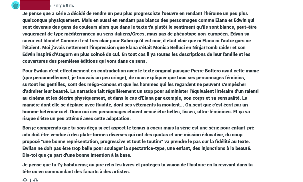 Nous assisterons en février à une adaptation, pas à un recraché du livre tel qu’il était dans les années 2000, et on juge une adaptation à la qualité de ses trahisons. Si la pire trahison de l’adaptation concerne la couleur de peau de personnages, de cheveux ou d’yeux, au profit d’imaginaires plus progressistes que l’œuvre de base, franchement je signe tout de suite pour la suite. Et par plus progressiste, je n’entends pas un non-sens absolu avec des tokens illogiques de partout comme dans la série Les Anneaux de Pouvoir ou tant d’autres. Mais une retouche cohérente pour faire correspondre le physique d’Ellana à son histoire, voilà qui est tout à fait entendable.