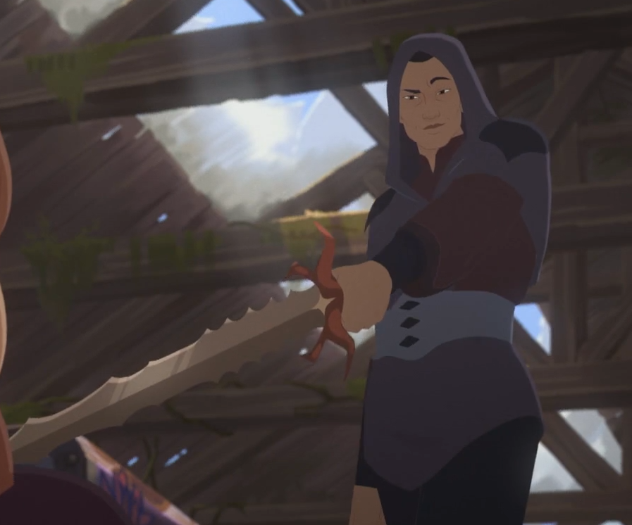 Alors avant toute chose je dois libérer ma haine et parler de sa manière de transporter son sabre dans son dos. Porter une lame dans son dos est un grand classique de la fantasy et c’est vrai que le visuel est assez beau, c’est aussi un endroit où personne historiquement ne transportait sa lame, pour la bonne raison que c’est tout sauf pratique, seule une lame très courte peut être sortie d’un fourreau dans le dos (ce qui pourrait fonctionner ici) mais ça reste légèrement plus lent et moins pratique pour bouger.